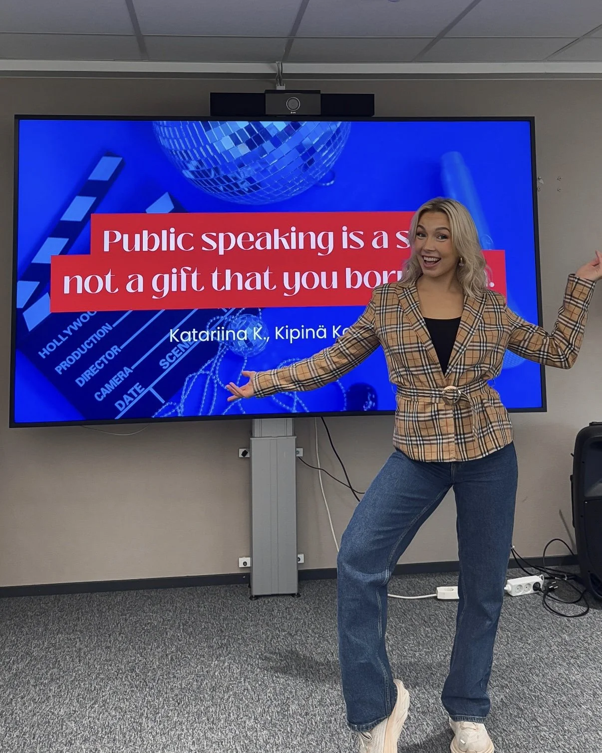 Hyödyllisintä oli päästä kuulemaan ja näkemään käytännössä hyvän esiintymisen teoria ja päästä kysymään kysymyksiä ammattilaiselta. Harjoitukset tuntuivat alussa kiusallisilta, mutta loppua kohden, kun ryhmä läheni, harjoitukset tuntuivat hyvältä. Kata osasi luoda kannustavan ja ystävällisen ilmapiirin.”